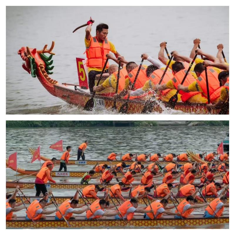 参赛者们齐心协力,和着鼓点的节奏,奋力划桨,龙舟如离弦之箭在水面上飞驰。