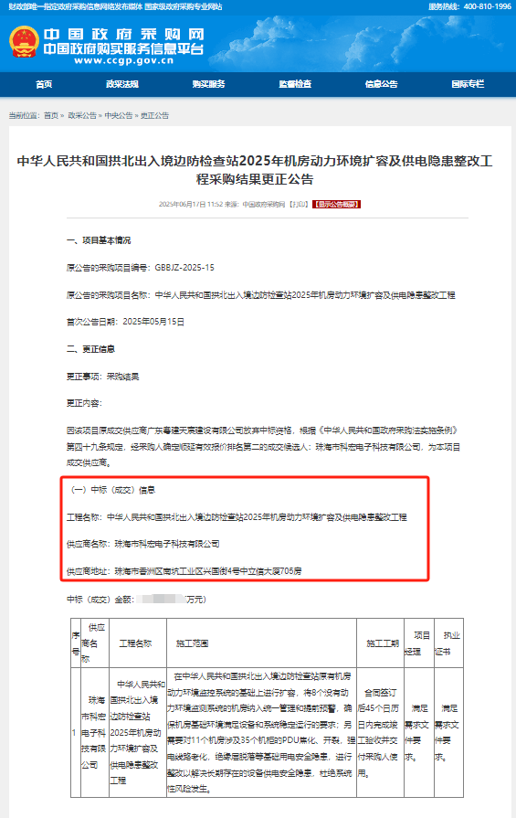 项目名称:中华人民共和国拱北出入境边防检查站 2025年机房动力环境扩容及供电隐患整改工程;