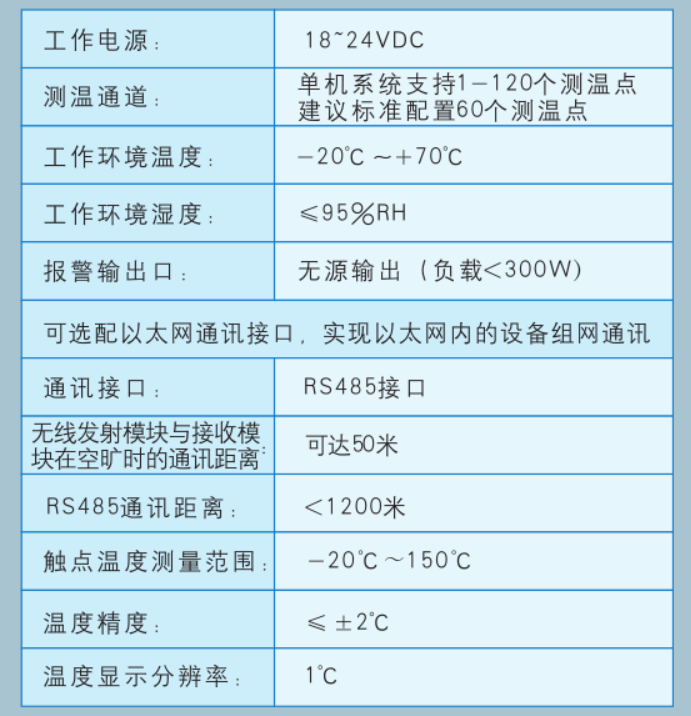 1) 多路无线测量温度实时数据显示,建议单机标准配置60个无线温度传感器。